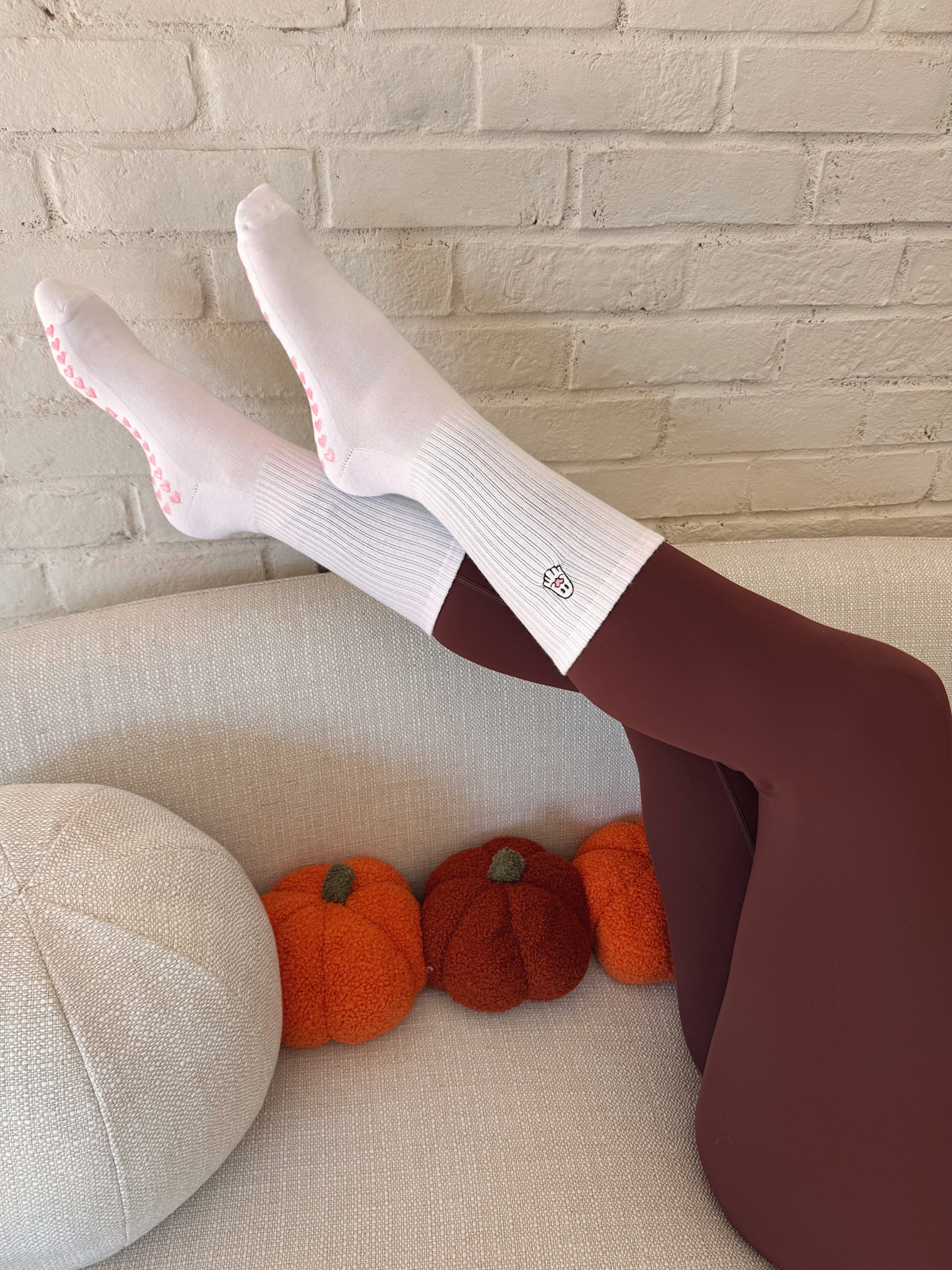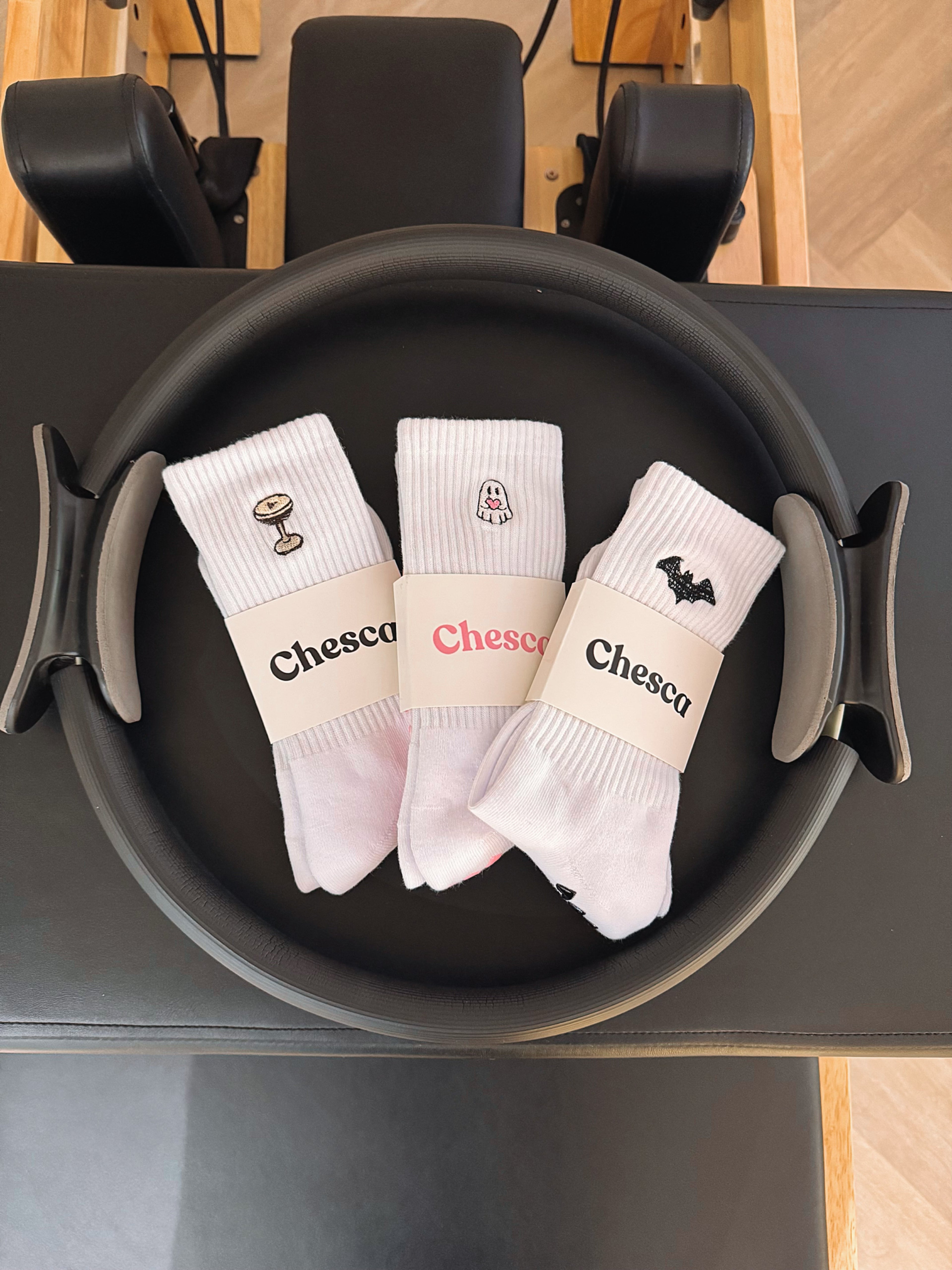 Step into spooky season with style. Our limited-edition autumn grip socks are scarily cute, with embroidered bat, ghost, and espresso martini emblems. Heart-shaped grips on the soles keep you steady through every Pilates move — and just as cozy when class is over.